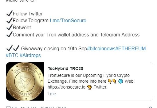 💌1000 #TRX #Giveaway 💌 4 Random People for 250 #Tron each Make sure to: ✔Follow Twitter✔Follow Telegram http://t.me/TronSecure ✔Retweet✔Comment your Tron wallet address and Telegram Address ✔✔ Giveaway closing on 10th Sep #bitcoinnews#ETHEREUM #BTC #Airdrops
