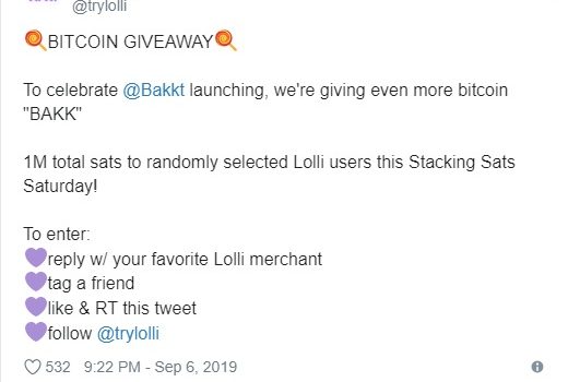 🍭BITCOIN GIVEAWAY🍭 To celebrate @Bakktlaunching, we’re giving even more bitcoin “BAKK” 1M total sats to randomly selected Lolli users this Stacking Sats Saturday! To enter:💜reply w/ your favorite Lolli merchant💜tag a friend💜like & RT this tweet💜follow @trylolli