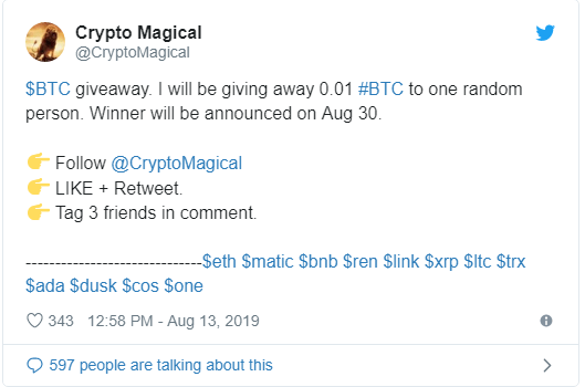 END DATE: 16/08/2019 TOTAL PRICE : $50 worth of any crypto you choose Twitter User ID: 1135616678090412032 Giveaway class : Neutral
