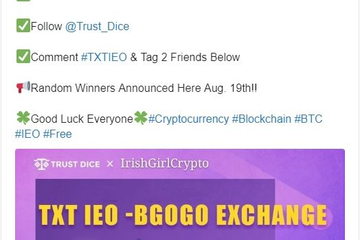 END DATE: 19/08/2019 TOTAL PRICE : $10 worth of btc #Bitcoin #Giveaway TWO LUCKY PEOPLE GET $10 $BTC EACH Easy Rules- Like & Retweet Follow @Trust_Dice & @CryptOwenWilson Comment #TXTIEO & Tag 2 Friends Random Winners Announced Here Aug. 19th!! Good Luck Everyone! #Cryptocurrency #BTC #IEO