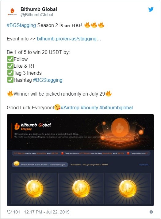 END DATE: 29/07/2019 TOTAL PRICE : $100 USDT PRICE: $20 USDT to 5 winners Twitter User ID: 1118439812631912448 All giveaways of this user : Click here